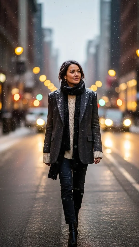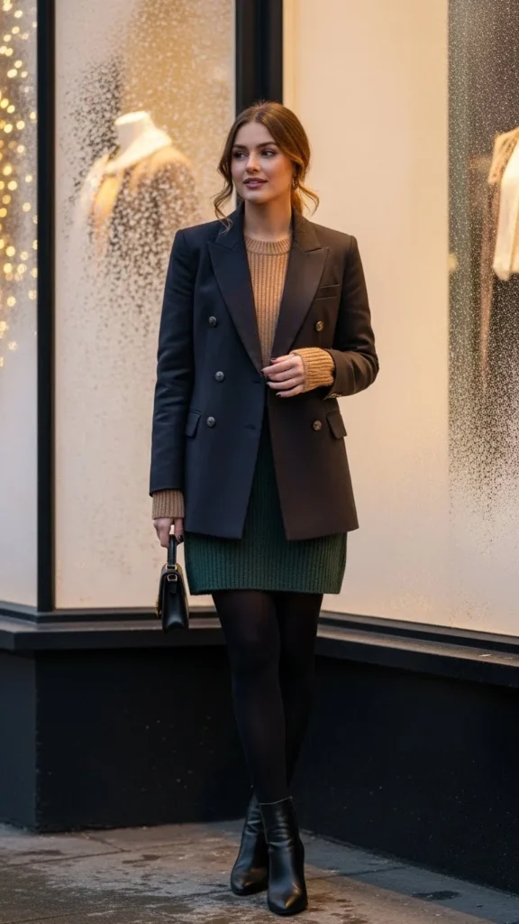 A double-breasted blazer adds presence. A sweater dress softens the silhouette. Tights keep warmth close. This look suits work nights or dinner plans. Choose sweater dresses in cable-knit or ribbed textures. Add knee-high boots for extra insulation. Keep jewellery minimal.