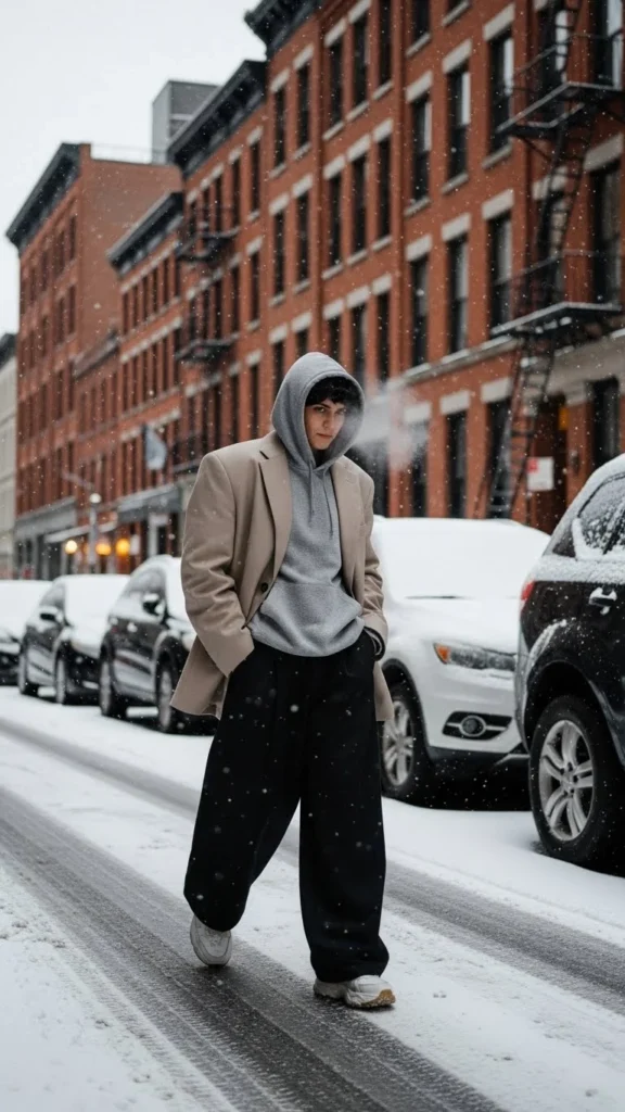 A hoodie softens the blazer’s structure. Wide-leg pants add movement. This combination suits travel days or relaxed routines. Choose hoodies in neutral winter shades. An oversized blazer creates enough room for thick layers. Add sneakers or boots depending on the day. This pairing feels comfortable while still looking clean.