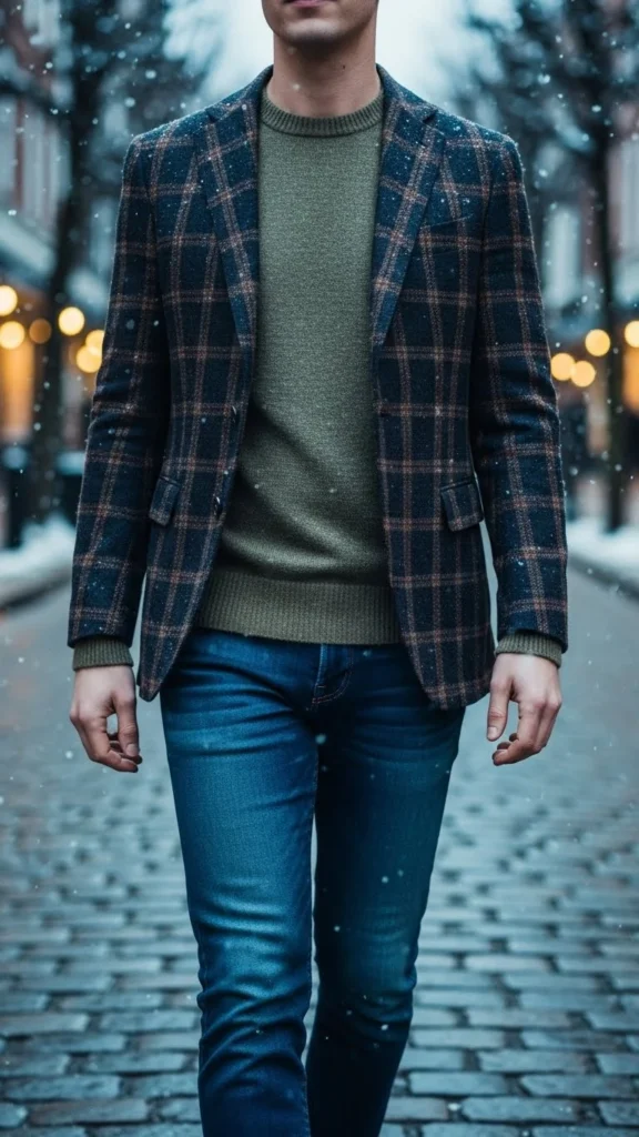Plaid adds quiet detail. A crewneck sweater warms the look. Dark denim anchors the outfit. This pairing suits casual winter days. Look for plaid blazers in thrift shops. Choose sweaters in soft tones so the pattern stays readable. Add boots in brown or black.