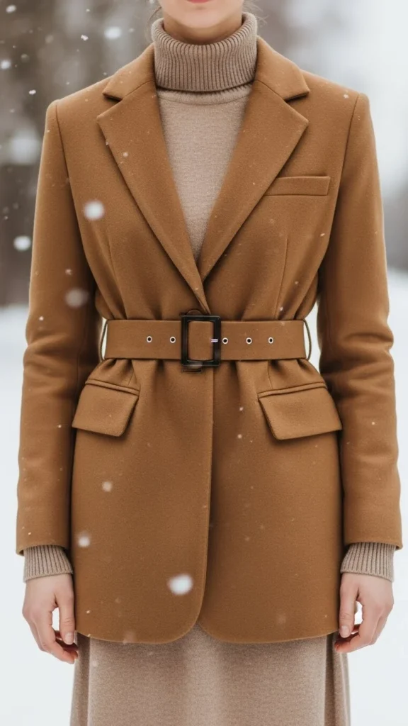 Camel blazers offer warmth in colour alone. A turtleneck dress complements the tone. A belt shapes the waist. This outfit suits gatherings or daytime outings. Choose dresses in wool blends. Add tall boots. Keep accessories structured—like leather bags—to match the blazer’s feel.