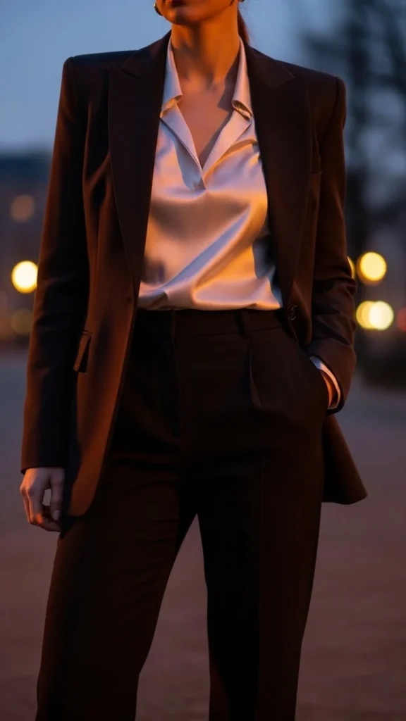 Satin adds softness under a structured blazer. Straight pants create clean lines. This pairing suits office or social events. Choose satin in muted jewel tones. Add subtle accessories. A wool coat can go on top without adding bulk.
