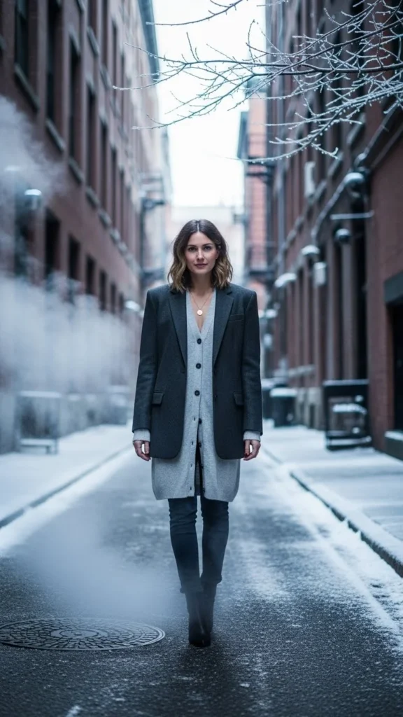 Layering a cardigan under a blazer adds depth. Slim jeans maintain balance. This combination suits light winter activities. Choose cardigans in ribbed or soft yarn. Neutral palettes work best. Add ankle boots or winter sneakers.