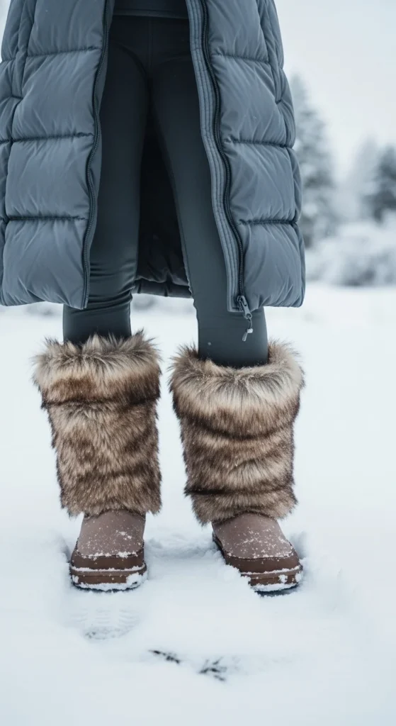 Faux-fur boots bring softness to cold days, especially paired with a puffer jacket. Keep the base simple—leggings or straight jeans work. Choose a puffer in a color that matches or complements the fur tones. If your puffer feels bulky, zip it halfway and layer a fitted top underneath. You can find fur-trim boots at affordable shops during winter sales. Add warm socks for comfort. This combo works perfectly for errands, walks, and travel days.