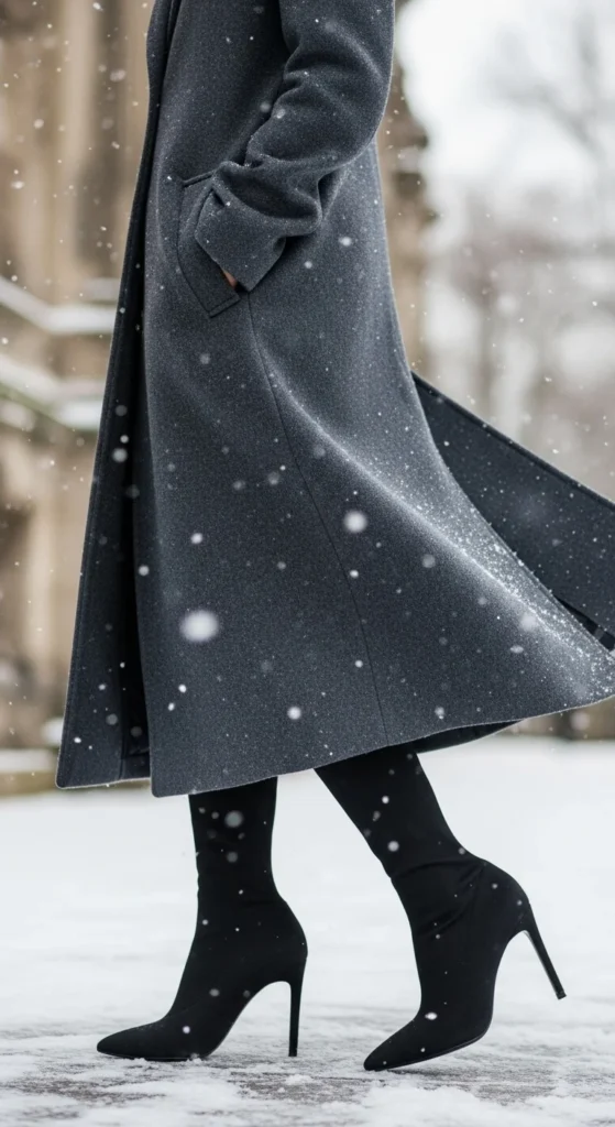 Sock-style boots pair naturally with a long coat because the slim boot shape balances the coat’s length. Choose dark boots if you want a seamless leg line. Under the coat, wear a fitted sweater and straight-leg pants or a midi dress. You can adjust warmth using thermal layers. If the boots feel tight, wear thinner socks. This pairing works for dinners, workdays, and travel because it layers well without feeling heavy.
