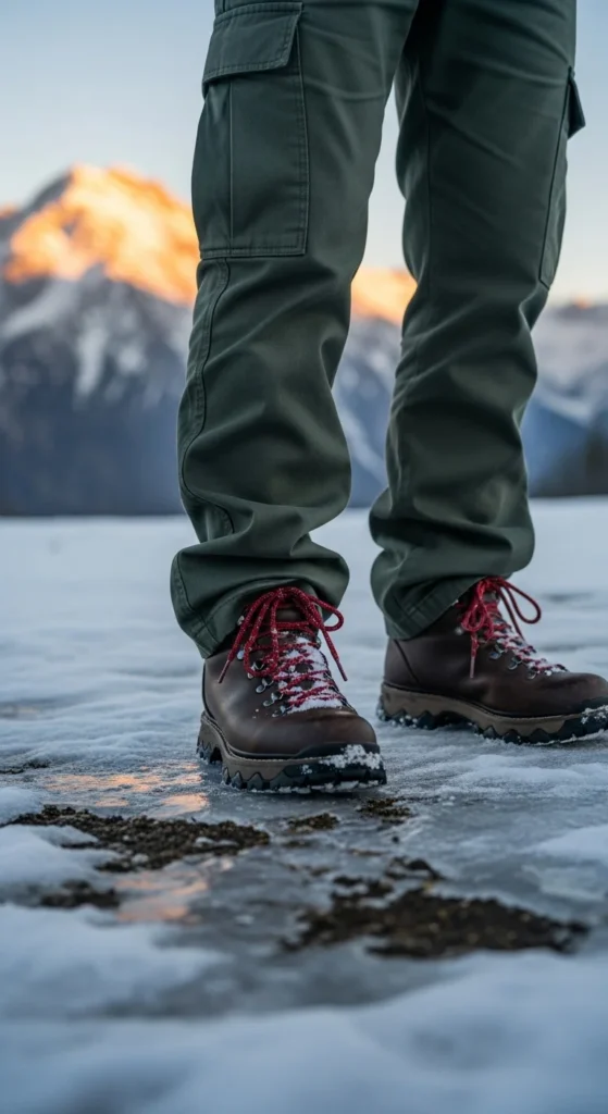 Hiking-inspired boots pair well with cargo pants when you want utility and comfort. Choose pants with adjustable hems so they sit neatly at the boot. Add a fleece jacket or hoodie layered under a windproof coat. You can recreate this outfit using outdoor pieces you already own. If the cargo pants feel too wide, tighten the ankle tabs. Keep accessories simple—a canvas backpack works. This combo is great for long walks or casual days outdoors.