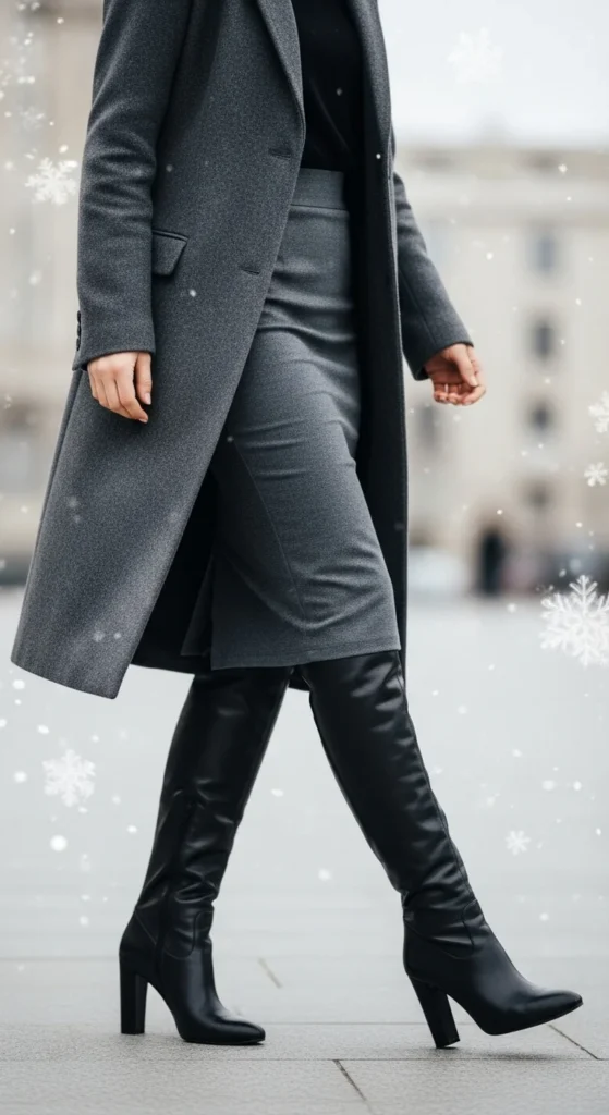 Heeled knee-high boots work naturally with a pencil skirt. Add a tucked blouse or fitted sweater on top. Wear a long coat for warmth and structure. If you want more comfort, choose boots with lower heels. You can thrift pencil skirts easily or repurpose an old office skirt. Add tights if you want insulation. This pairing suits office days, dinners, or coffee meetings. It feels strong and easy to wear.