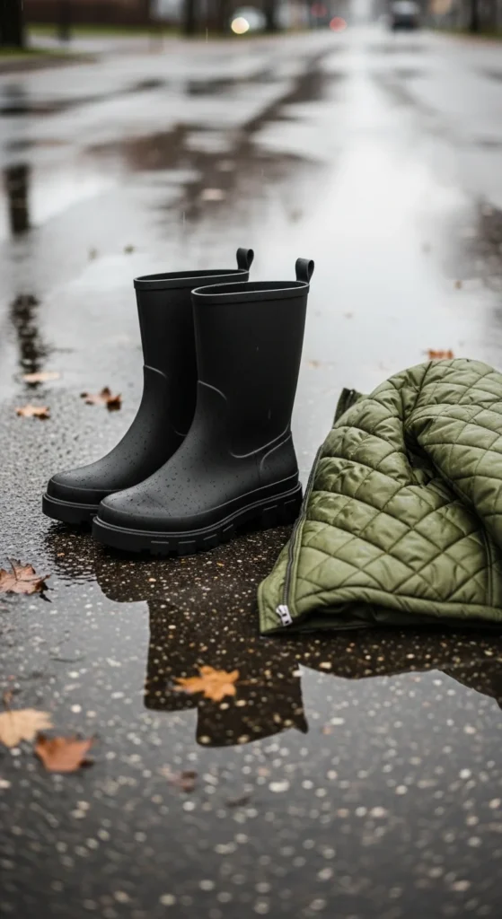 Rain boots work well with quilted jackets on wet winter days. Wear leggings or fitted jeans to keep the lines clean. Add a knit beanie for warmth. You can find rain boots in budget shops, especially in neutral colors. If the jacket feels too thin, add a hoodie underneath. This outfit keeps you dry while still looking put-together.