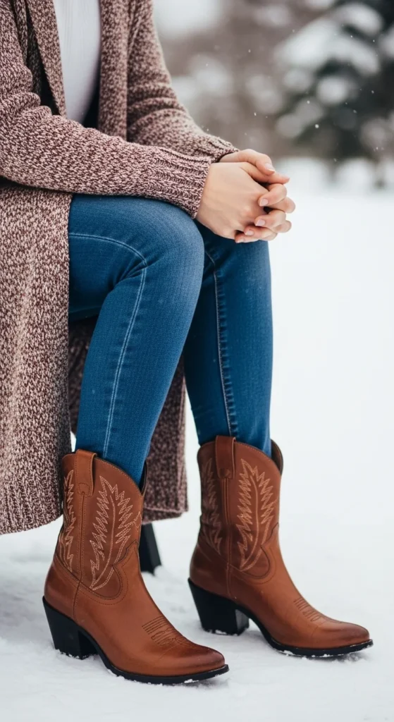 Western boots add character to a simple winter outfit. Pair them with jeans and a long cardigan. Add a thermal top underneath for warmth. If you want more shape, belt the cardigan. You can thrift western boots or buy faux-leather versions. This combo feels relaxed and works for daytime plans or casual evenings.