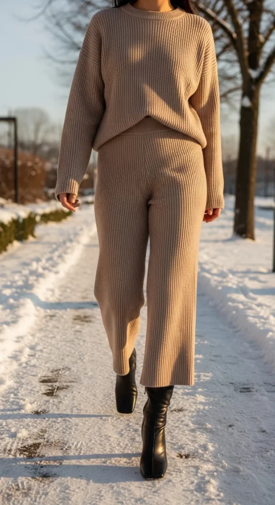 Square-toe boots give a clean shape to a ribbed knit set. Add a long coat in a matching tone for cohesion. If the set feels clingy, layer a slip underneath for smoother lines. You don’t need expensive pieces—many affordable ribbed sets look great layered. This outfit suits everyday outings and cozy indoor-to-outdoor days.
