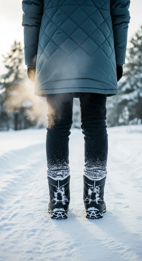 Snow boots paired with fleece leggings and a parka keep you warm on the coldest days. Add a scarf and gloves for insulation. Keep colors simple if you want a cleaner look. If your parka feels bulky, leave it open when indoors. This outfit is practical for long walks, errands, or travel days. You can recreate it with basic winter gear.