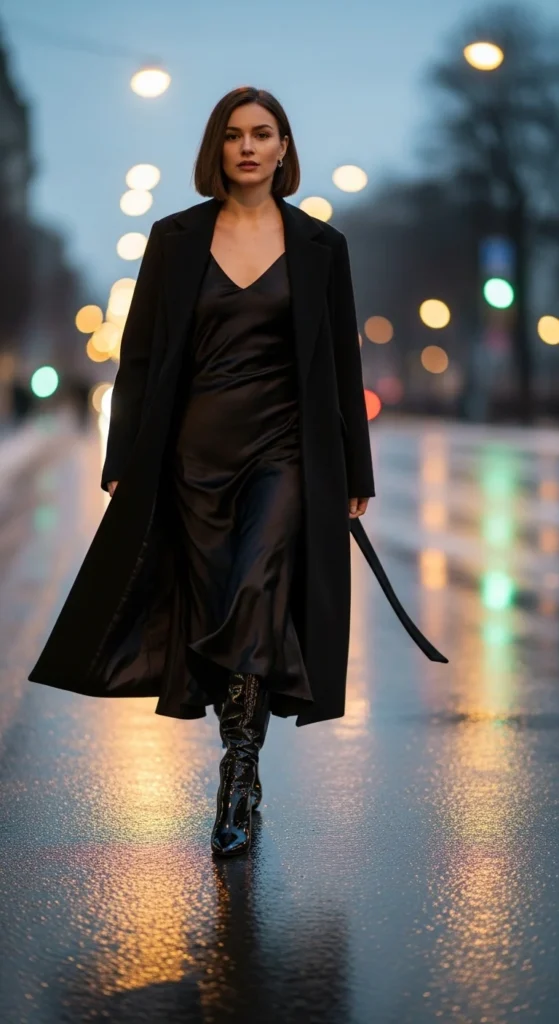Patent boots add shine to a satin midi dress. Add a long coat to balance the textures. Wear tights if you want warmth. If your dress feels too summery, layer a thin sweater underneath. You can thrift satin pieces easily. This combo works for winter parties or dinners out.