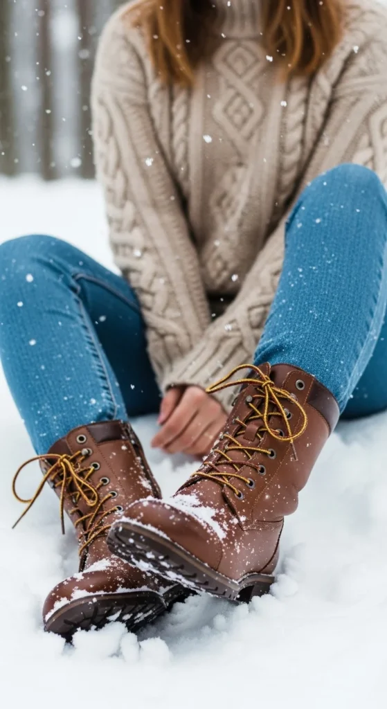 Brown leather boots feel grounded next to a cable-knit sweater. Wear jeans in any wash—light, medium, or dark. Add a wool coat for warmth. If your sweater itches, add a thin layer underneath. This outfit works for casual winter routines and feels calm and warm.