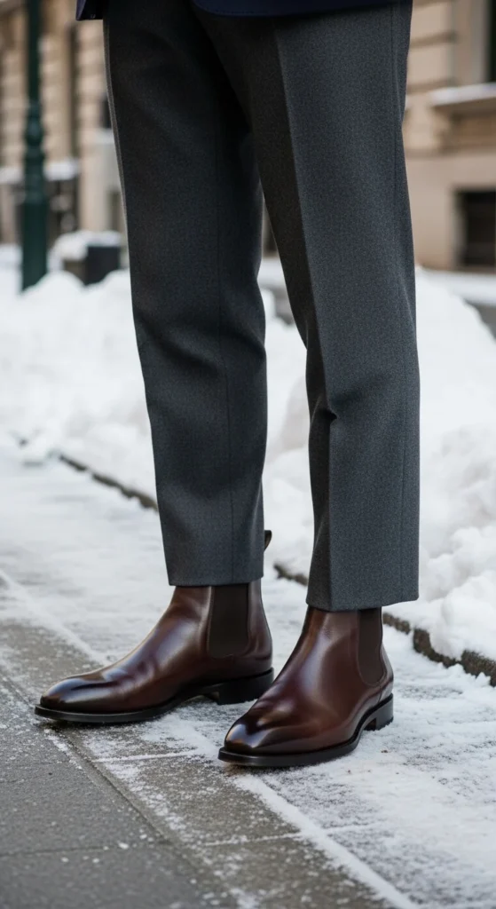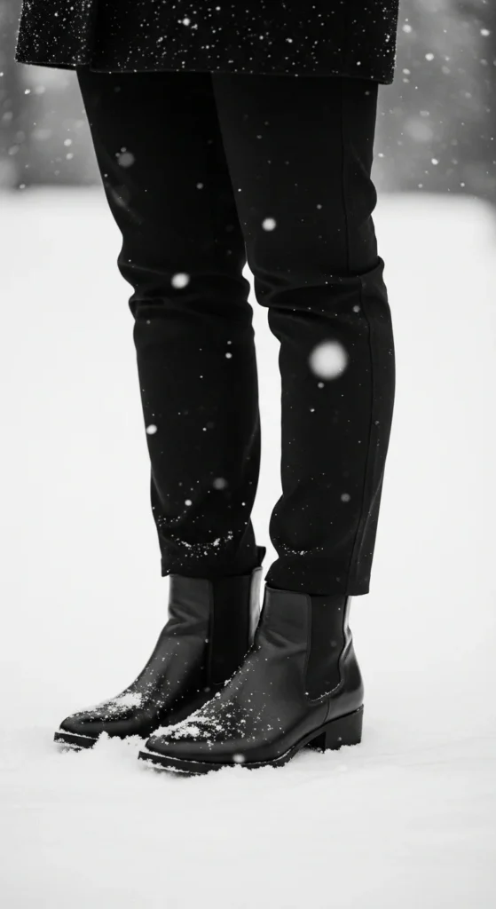 Chelsea boots give wool trousers a relaxed but sharp balance. Choose trousers with a slight crop to reveal the boot’s elastic panel. A tucked sweater or thin knit polo keeps the upper half neat. Add a structured coat for warmth. You can recreate this at home using any straight-leg trousers—no need for expensive tailoring. If your sweater feels bulky, fold the hem into your bra band for a temporary tuck. Add a simple shoulder bag for a clean finish. This pairing works for office days, dinner meetups, or quiet mornings in town. It feels calm, easy, and polished.