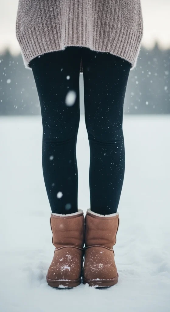 Shearling boots pair well with leggings when you want comfort without losing shape. Choose thicker leggings for colder days. A long hoodie or oversized knit adds warmth and covers the hips if you prefer more coverage. For extra insulation, add a thin puffer vest layered under a coat. You can recreate the look with budget pieces because the focus sits on texture rather than labels. If your leggings slide, switch to a high-waist version. Keep accessories simple—maybe a warm scarf that complements the coat. This outfit works for school drop-offs, grocery runs, or cozy weekend outings.
