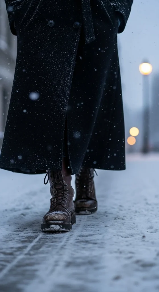 Combat boots work nicely under an oversized coat because the contrast makes the outfit interesting. Start with simple basics: black jeans and a fitted top give you a clean base. The coat becomes the main layer, so pick one with a bit of structure. If you don’t own one, try thrifting—oversized wool coats are easy to find. If the boots are heavy, add thick insoles for comfort. A chunky scarf softens the look. You can wear this combo for busy days that need walking comfort. It looks intentional without asking for much planning.