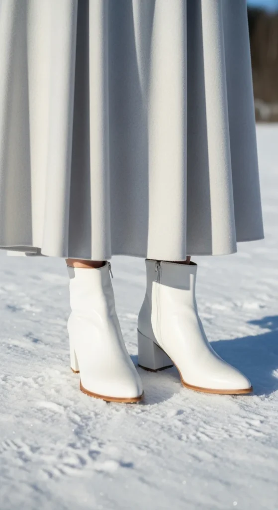 White ankle boots brighten a winter outfit instantly. Pair them with a midi skirt—pleated, knitted, or satin all work well. A tucked sweater adds warmth while keeping the waist defined. If you want movement, choose a skirt with light fabric. If you want warmth, choose ribbed knit. Add a long coat in beige or camel for a soft finish. You can re-create this easily using a skirt you already own. If the boots scuff, clean them with a small amount of baking soda paste. This pairing feels calm, pretty, and easy to repeat all season.