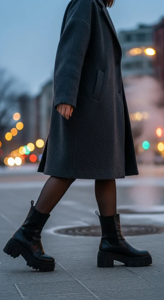 Platform boots add height while keeping comfort steady. Black tights balance the silhouette and bring everything together. Add a mini skirt or skort depending on what you have. A fitted turtleneck and wool coat keep you warm. If you want a touch of fun, add textured tights like subtle rib or micro-dots. You can thrift the skirt or repurpose an older one. If your platform boots feel unstable, add cushioned insoles. This look works for outings, casual dates, or weekend strolls. It feels modern without being difficult.