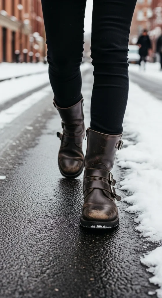 Chunky lug-sole boots pair naturally with straight-leg jeans because the shapes complement each other. Pick jeans that stop right at the boot for the cleanest line. If your jeans are longer, cuff them once instead of rolling multiple times. A fitted turtleneck and puffer coat add warmth without crowding the look. If you want a slightly edgy finish, choose a leather jacket. You can recreate this with items you already own—old jeans work perfectly. If your boots feel stiff, wear thicker socks until they soften. Add a beanie in a simple color for balance. This combo handles errands, long walks, and cold commutes easily. It feels simple but visually grounded thanks to the boot’s shape.