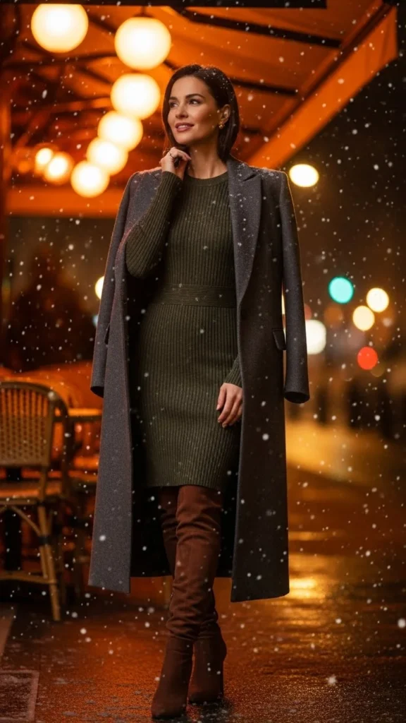 A knit dress keeps things warm while shaping the outfit softly. Tall boots add height and comfort for winter dates. Choose a long coat for structure. This pairing works for dinner or relaxed evening walks. If the dress feels thin, slip on thermal tights underneath. A small bag adds a gentle finishing touch. Pick colors like mocha, charcoal, or cream for a calm tone. You can recreate this look affordably with thrifted dresses and neutral coats. Add a scarf if you expect wind but keep accessories light. A soft fragrance and simple earrings help complete the look without pulling attention away from the outfit’s clean lines.
