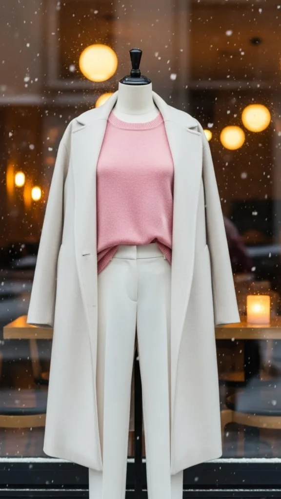 Soft pink brings gentle warmth. Pair it with white pants for a bright winter look. Add a cream coat for cohesion. Choose boots in beige tones. If white pants intimidate you, pick off-white or light beige. A small handbag completes the look. This outfit suits brunch-to-evening dates. It’s easy to recreate with affordable knits. Layer thermal leggings under the pants for warmth.