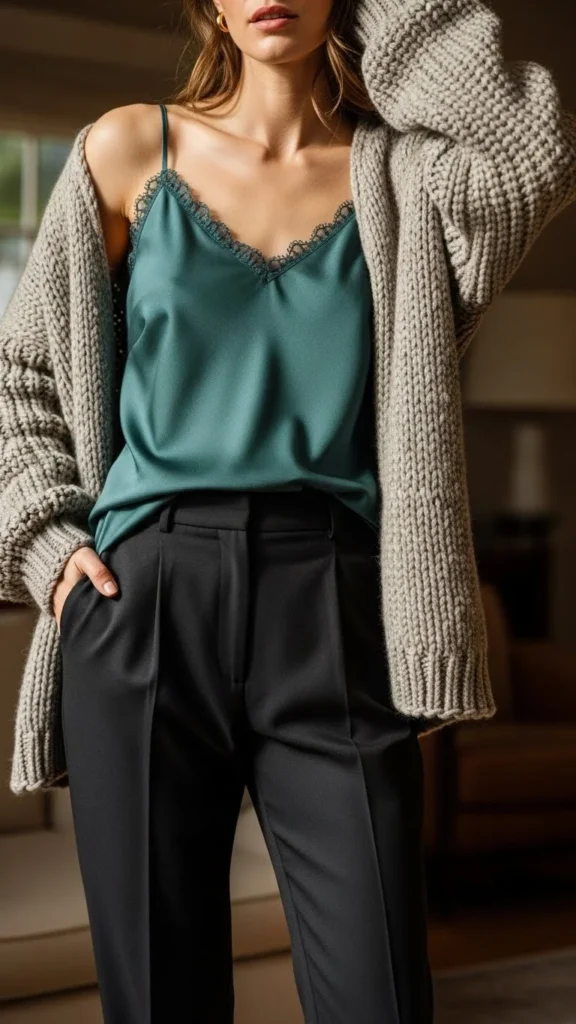 A silk camisole adds softness. A thick cardigan adds warmth. Tailored pants keep the look structured. This pairing works for indoor dates where warmth matters but heavy coats aren’t needed. A small shoulder bag or clutch works well. Choose soft tones like champagne, taupe, or charcoal. You can recreate the look cheaply with satin-finish tops. Add a delicate necklace to complement the camisole’s neckline.