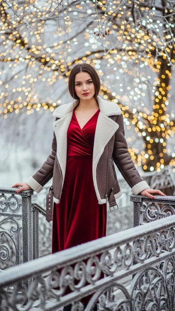 Velvet brings romance. Pair it with a shearling jacket for warmth. Add tights and boots. Choose deep colors like wine, emerald, or midnight. A small bag fits the mood. If the jacket feels bulky, choose a cropped style. This outfit suits holiday dates, concerts, or intimate dinners. Affordable velvet dresses recreate the look easily.