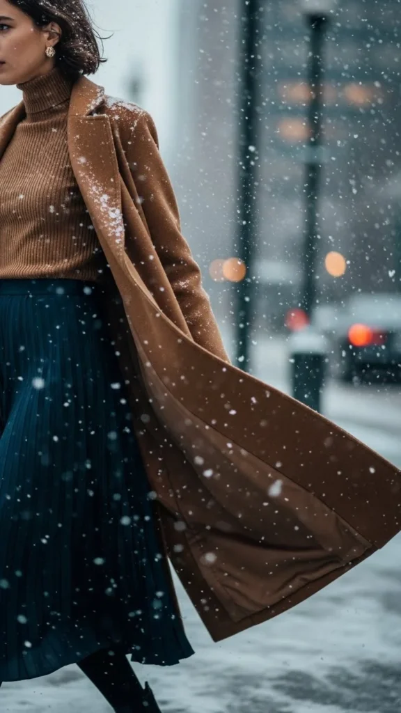 A ribbed turtleneck keeps you warm. A pleated skirt adds elegant movement. A long coat gives structure. Add tights for warmth. Heeled boots work best for balance. Pick soft colors for a romantic feel. You can recreate this look with budget skirts. A small handbag softens the outfit’s lines. This pairing works well for cultural dates or quiet dinners.