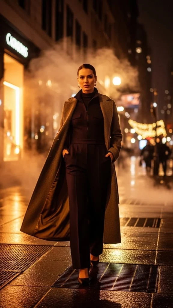 A jumpsuit creates a clean silhouette. A wool coat adds warmth. Choose boots with a slight heel. If the jumpsuit is sleeveless, layer a thin thermal top underneath. Keep accessories minimal. This outfit suits nice dinners, drinks, or theater nights. You can find affordable jumpsuits that work well in winter. The coat carries most of the visual structure.