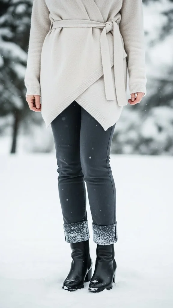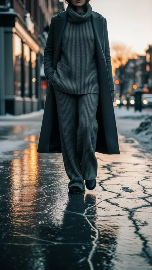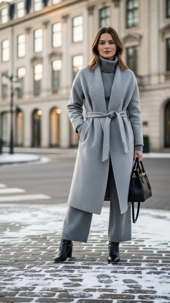 A matching knit set feels polished and warm. Add a wrap coat to shape the waist. Heeled boots introduce height without discomfort. Choose earth tones or muted winter shades. A medium-sized bag works well. If you want more warmth, wear thermal layers beneath the knit set. This outfit works for day-to-night plans. You can recreate it cheaply by pairing two knits in similar tones. The wrap coat adds gentle romance.