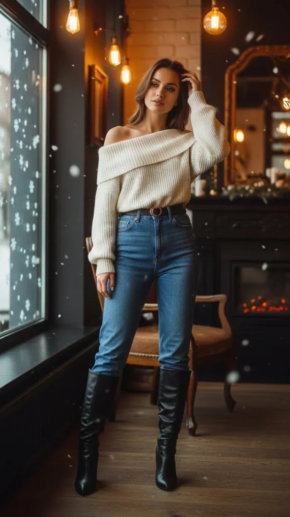 Off-shoulder knits show subtle skin while staying warm. High-waist jeans create shape. Heeled boots add height. Choose a soft, textured knit. Wear a strapless thermal top underneath to stay warm. A small shoulder bag works well. This outfit suits casual dates, dessert nights, or winter strolls. Budget sweaters recreate this easily.