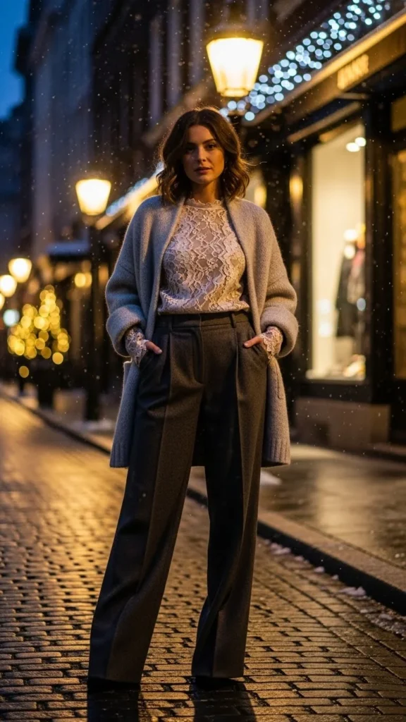 A lace top adds charm. A cardigan jacket adds warmth. Wool trousers keep the outfit structured. Add boots for comfort. Pick neutral tones so the lace stands out. A clutch works well for dates. If lace feels too cold, layer a nude camisole underneath. This outfit works for indoor winter plans and cozy restaurant dates.