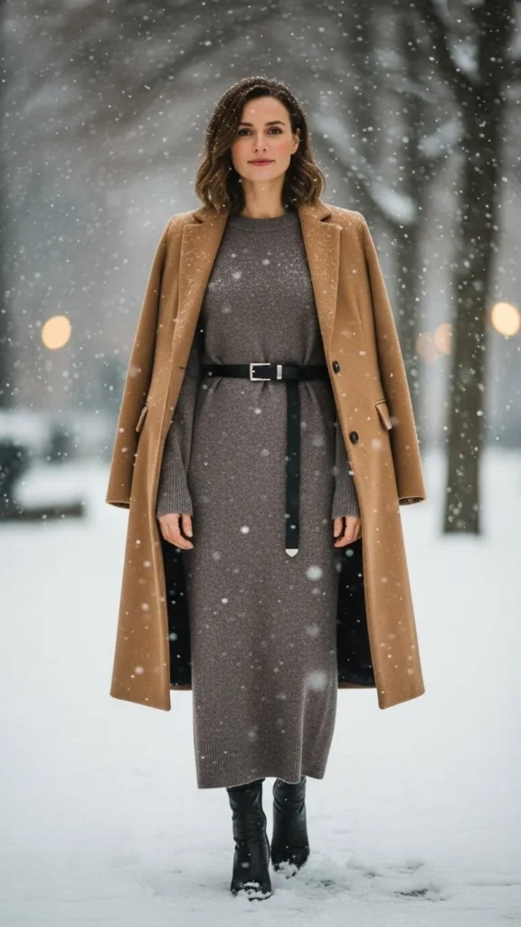A long sweater dress feels warm and relaxed. Add a belt to define your waist. A structured coat gives shape. Boots finish the outfit. Choose soft earth tones. Wear thermal tights for extra warmth. You can recreate this look with thrifted dresses. A small handbag ties everything together. This outfit fits casual dinners or quiet evening walks.