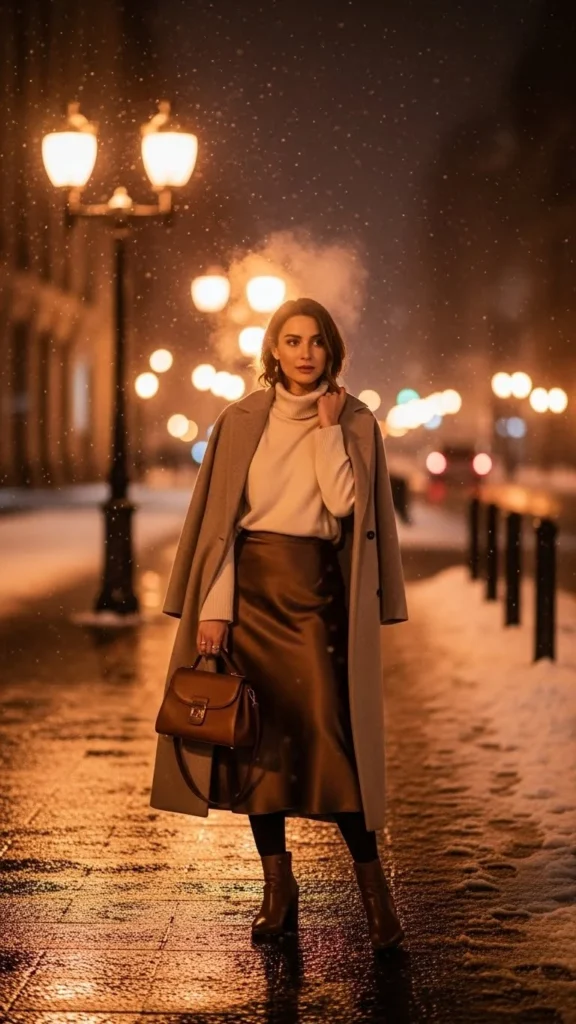 A satin skirt brings movement, especially in cold winter air. Pair it with a soft turtleneck for warmth. A wool coat gives structure without overpowering the outfit. Add ankle boots for stability on icy streets. Keep the color palette muted—cream, taupe, or charcoal work well. If you want extra warmth, layer thermal shorts under the skirt. A shoulder bag adds a romantic finish. This outfit works for casual dinners or nighttime strolls. You can recreate it on a budget by choosing satin-look fabrics from affordable stores. The skirt’s subtle shine adds charm without trying too hard.