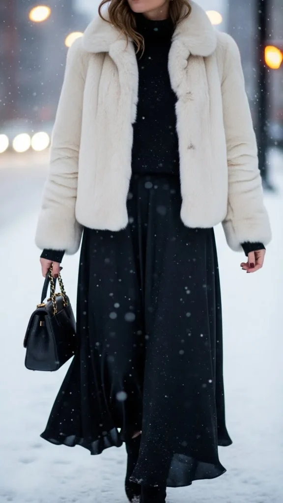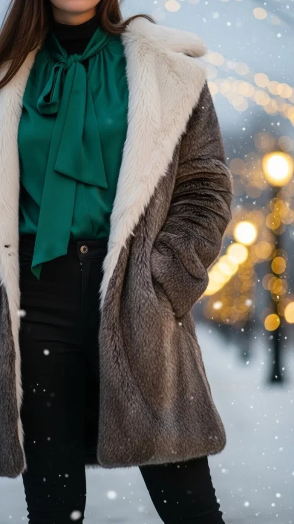 A silk blouse adds shine. Faux-fur adds warmth. Black jeans keep the look grounded. Add boots for comfort. Choose a faux-fur coat in muted tones like cream or brown. A small bag suits the mood. If you want a budget-friendly version, choose faux-silk instead. This outfit works for casual-but-romantic nights out.