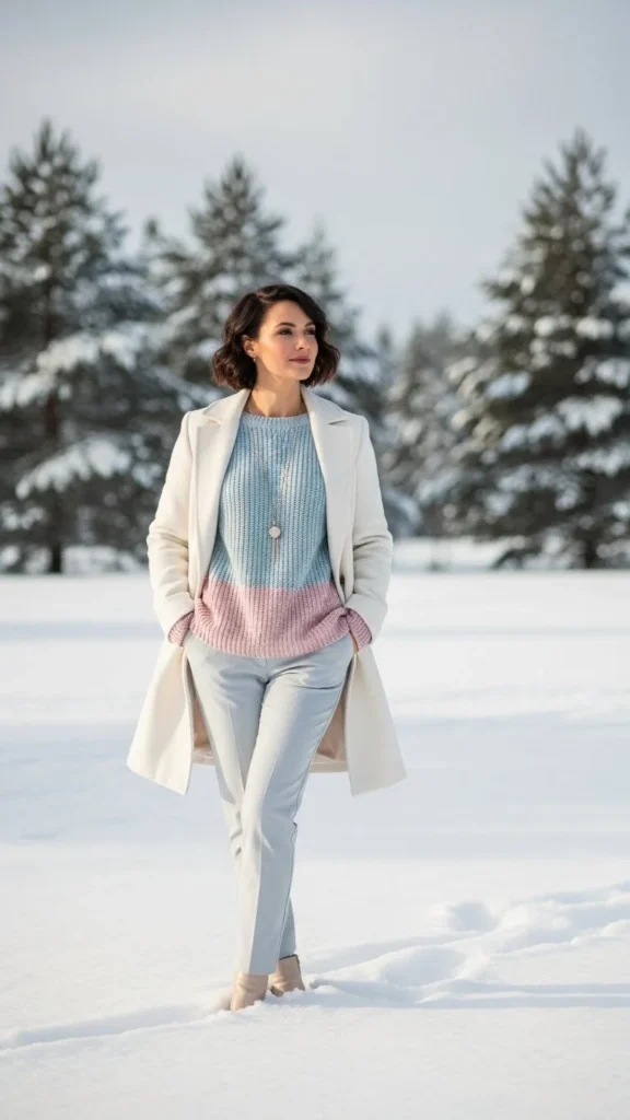 Pastels soften the winter palette. Pair a pastel knit with light trousers. Add a winter white coat for a clean finish. Wear beige boots. A small bag adds charm. This outfit suits gentle, romantic dates. Add a scarf if needed. It’s easy to recreate with affordable knits.