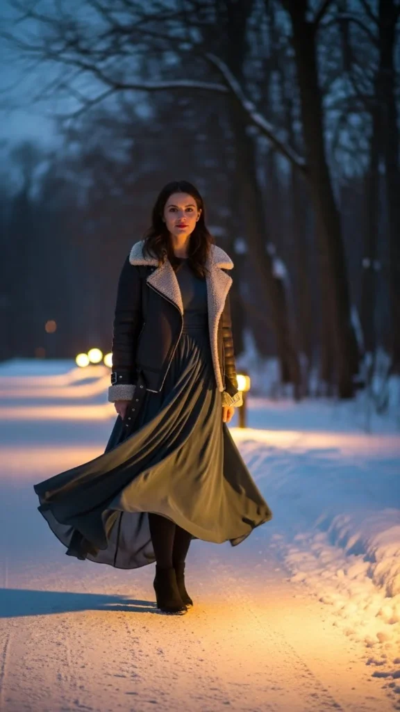 A shearling jacket adds warmth. A flow dress adds softness. Tights keep you warm. Add boots for balance. Choose dresses with dark florals or soft solids. A small bag works best. Add a slip under the dress for extra warmth. This outfit suits outdoor markets, lights festivals, or cozy dinners.