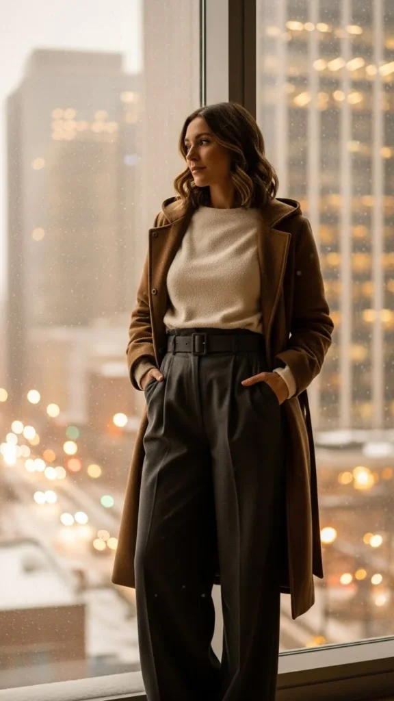 3. Cashmere-Touch Sweater + Wide-Leg Pants + Belted Coat