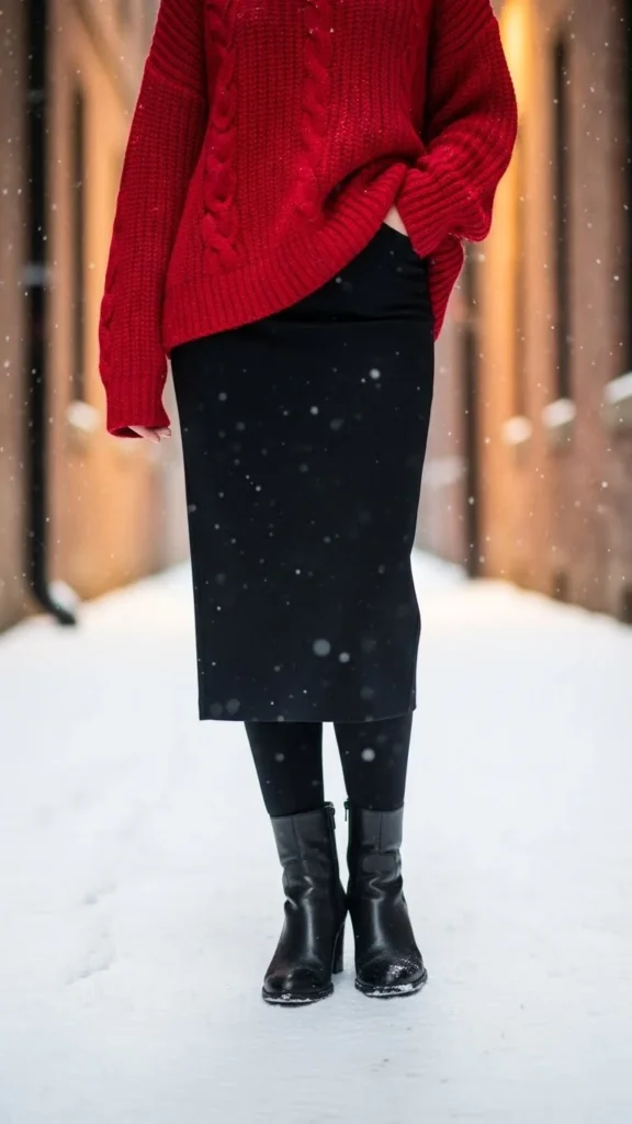 Red brings warmth to winter nights. Pair a cozy red knit with a black skirt for contrast. Add tights and heeled boots for comfort. A long coat completes the look. This outfit works well for restaurant dates or warm indoor settings. Keep accessories simple so the red stands out. You can recreate this affordably with thrifted knits. A soft hairstyle—loose waves or a low bun—adds gentle charm. If you feel cold, choose fleece-lined tights. The red sweater adds a romantic tone without feeling dramatic.