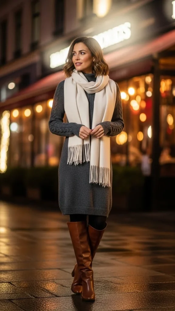 Sweater dresses offer warmth without complexity. Knee-high boots bring structure. Add a soft scarf for a romantic layer. Keep colors cohesive—monochrome or soft neutrals look calm. Choose fleece-lined tights if you plan to be outdoors. A shoulder bag works well for hands-free comfort. You can shape the dress with a slim belt if you want definition. This outfit suits simple dinner dates, movies, or winter festivals. Affordable sweater dresses work perfectly here.